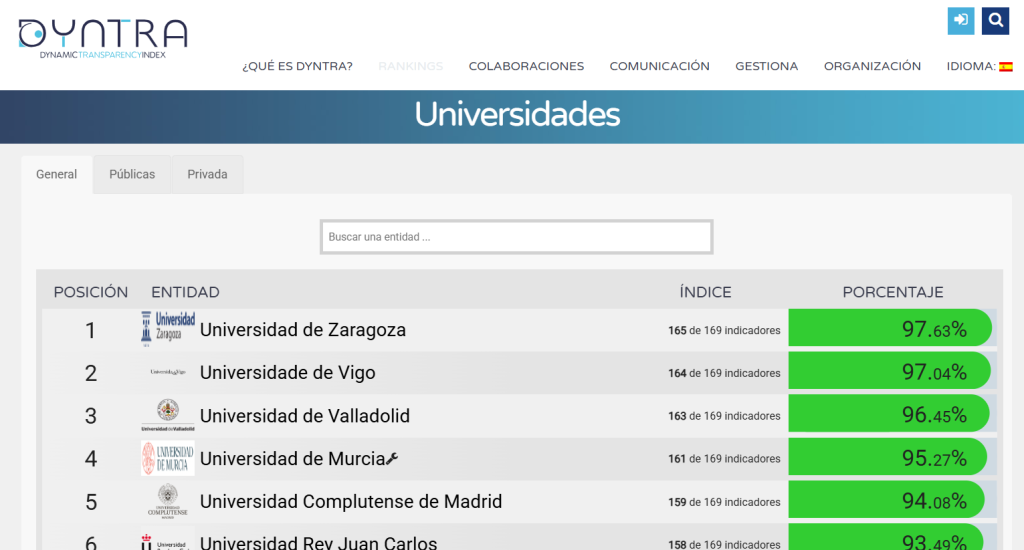 El ranking Dyntra de análisis de transparencia de las instituciones abrió hace unos días un nuevo periodo de evaluación que ha colocado a la Universidad de Zaragoza como la más transparente de España, empatada con la Universidad de Huelva, no obstante es un ranking dinámico, por lo que puede sufrir modificaciones, lo que nos hace seguir trabajando día a día por mantener o mejorar nuestra posición.